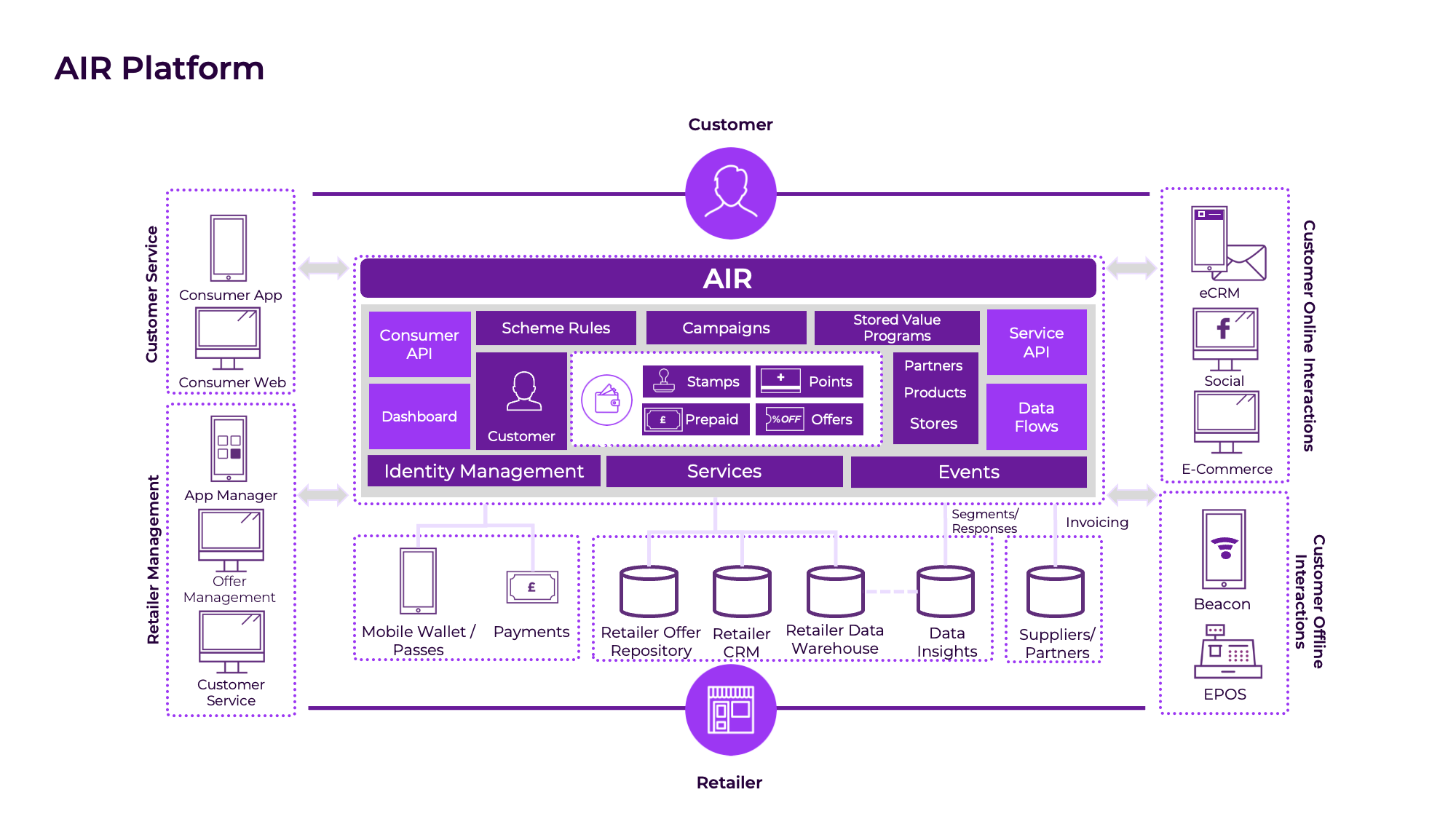 A high-level overview of the AIR platform is shown below. AIR is highlighted in purple as part of the transactional layer connecting with a retailer's ecosystem via the range of integration points.