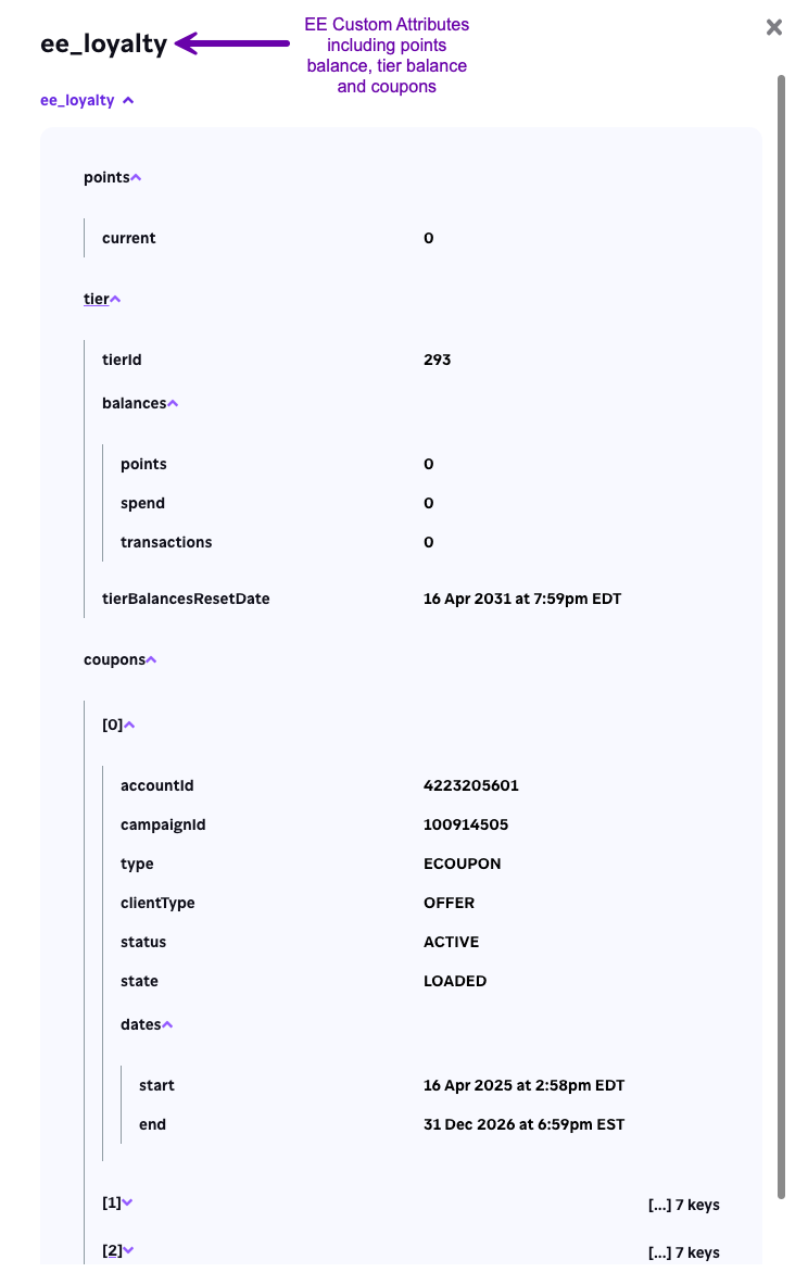 - Any other EE related custom properties are stored in a ee_loyalty object, which includes things like