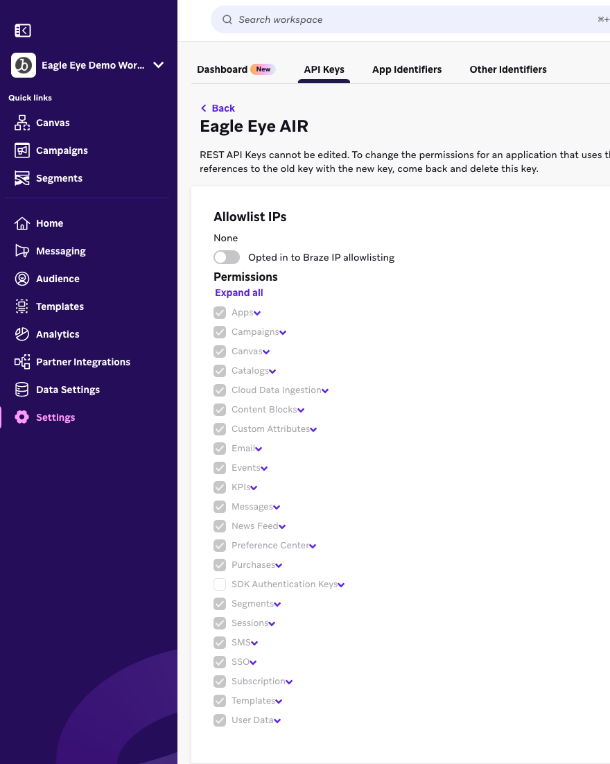 - Braze partner name/string: a string required for requests made by Braze partners, for tracking/debugging/analytics purposes. Currently set from an environment variable at deployment time.