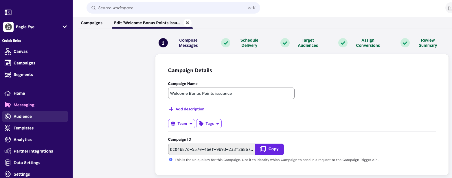 identifiergenerated and share with Eagle Eye for connector configuration. This will be thebrazeAppIdfor EE connector setup.