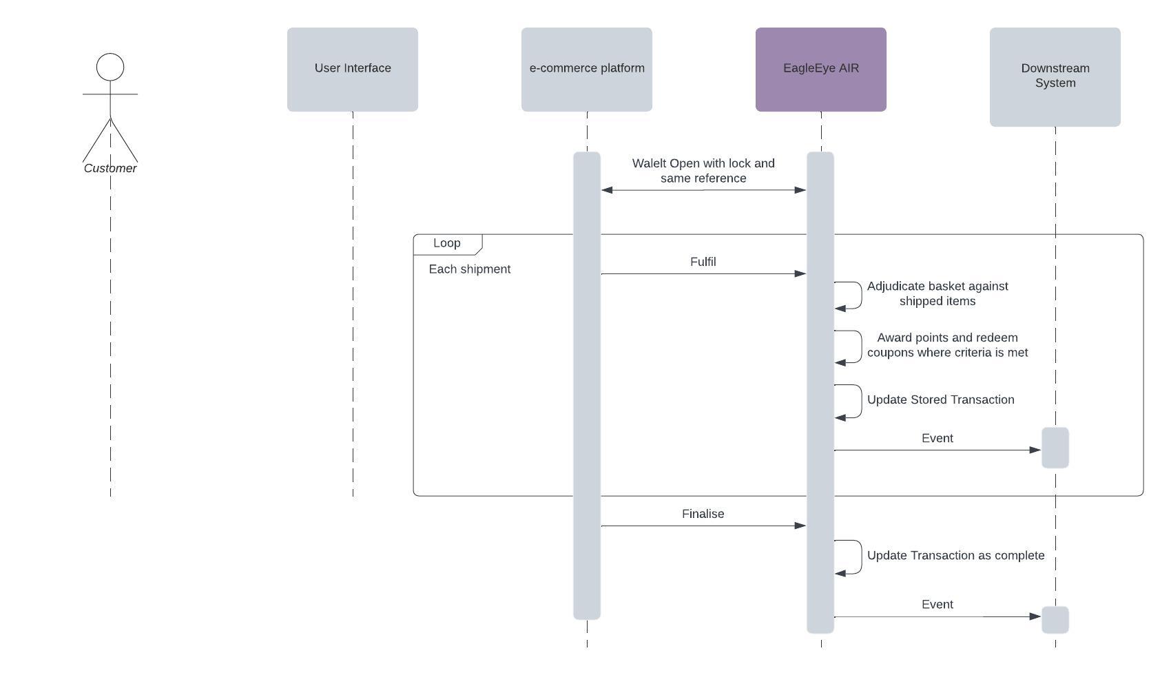 Once the order is fulfilled, the e-commerce platform must inform Eagle Eye that the transaction is complete. At this stage, the transaction is marked as SETTLED, any points earned get awarded to the customer, any coupons used in the transaction are redeemed and any point-spending transactions are completed.